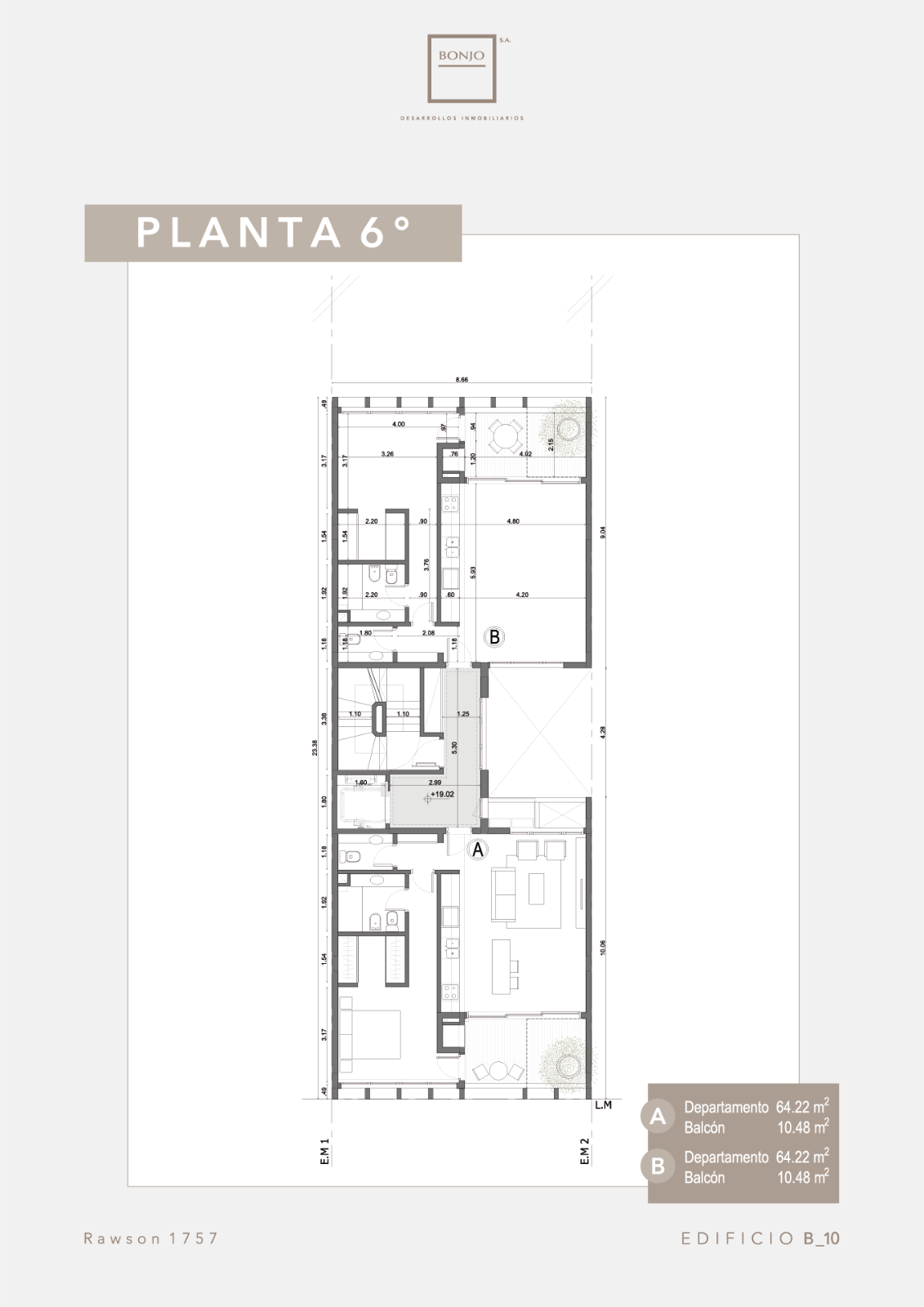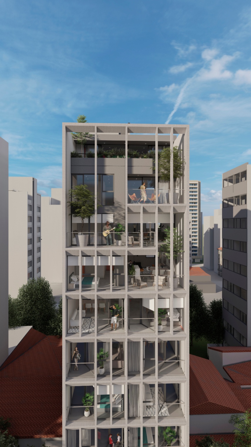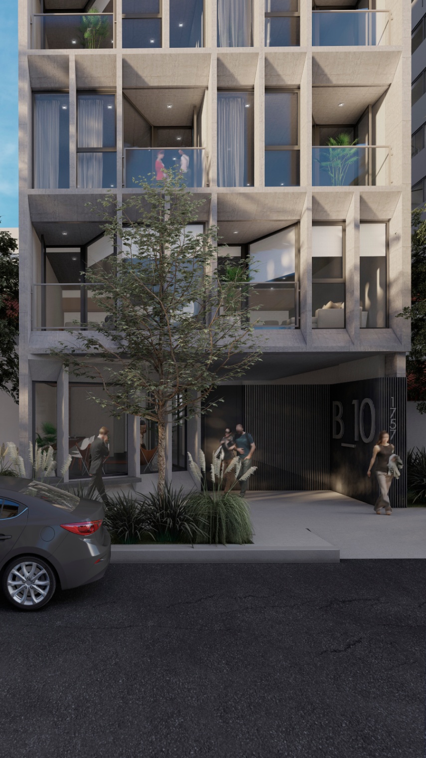 BONJO 10 constará de 8 plantas: del piso uno al quinto serán destinados a cuatro unidades de 1 ambiente (36 m²) por piso. Las unidades al frente con balcón saliente.