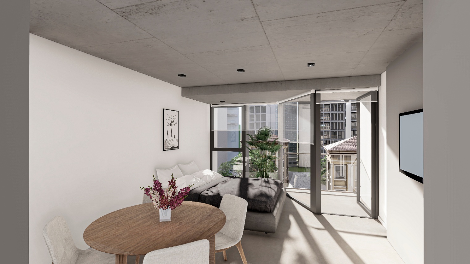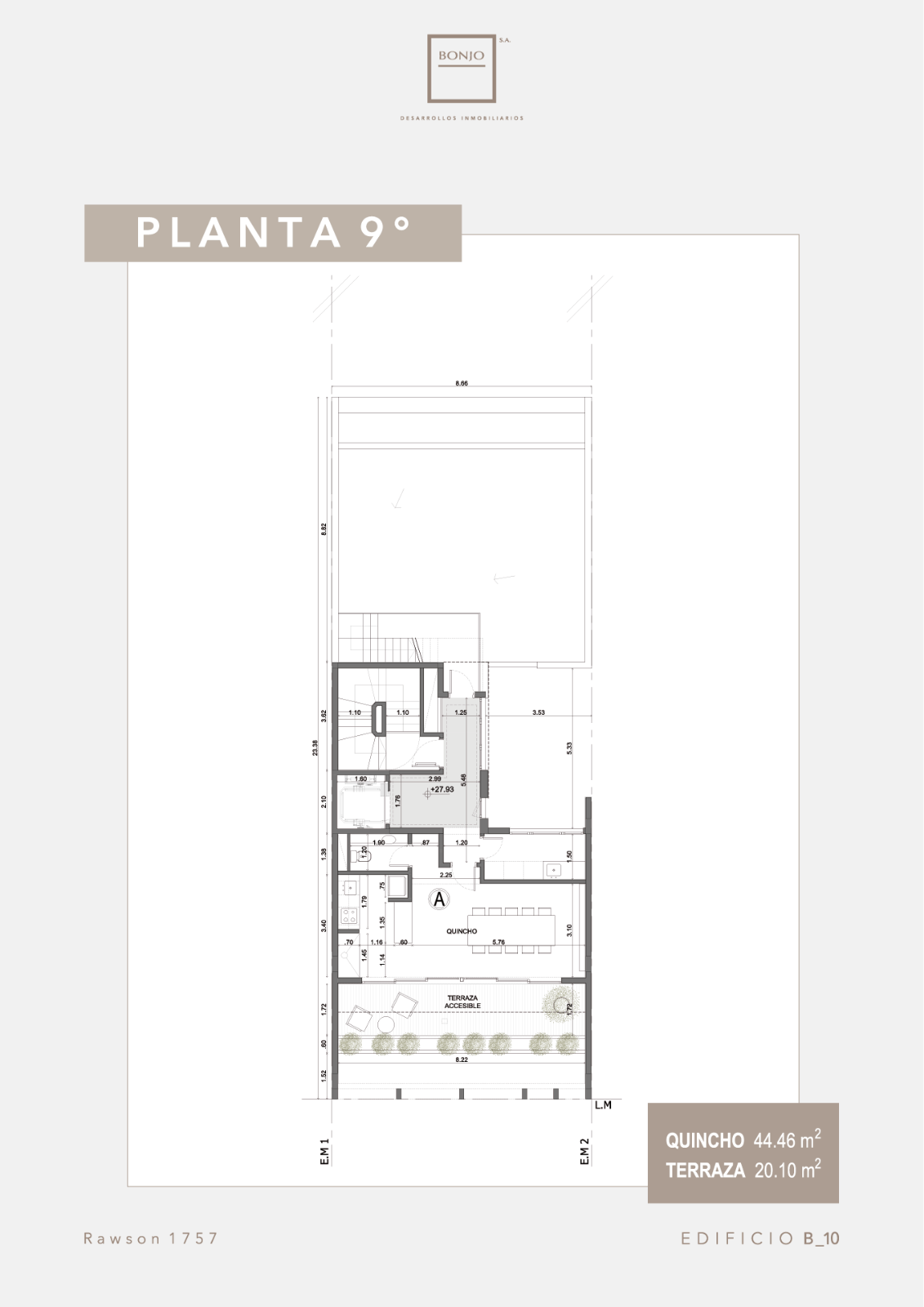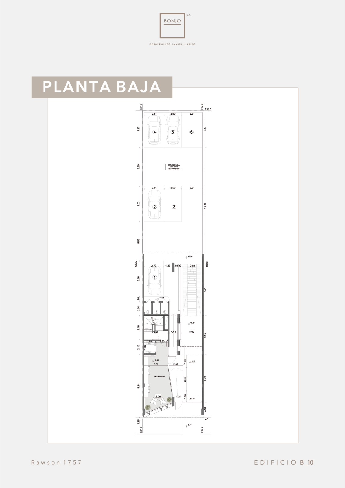 BONJO 10 constará de 8 plantas: del piso uno al quinto serán destinados a cuatro unidades de 1 ambiente (36 m²) por piso. Las unidades al frente con balcón saliente.