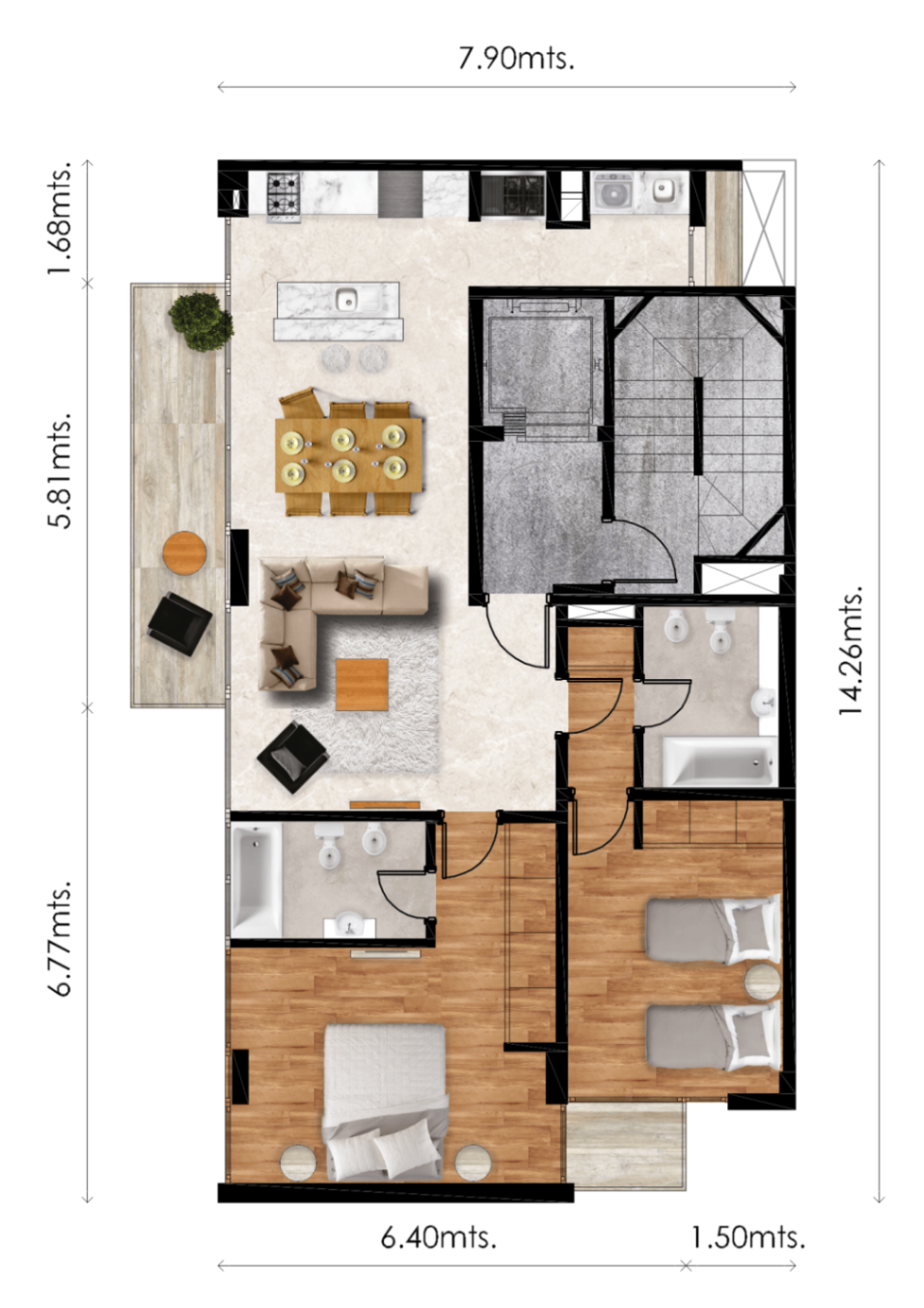 · Pisos de madera natural en living-comedor y dormitorios.
