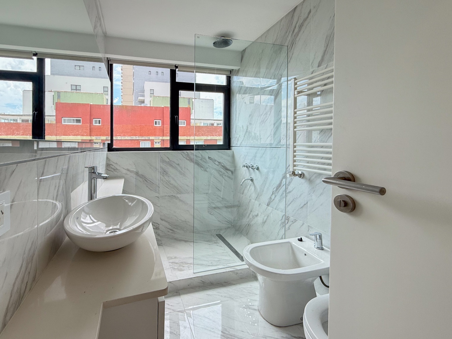 · Dormitorio principal en suite con box de ducha y ventilación natural, a la calle, y con gran placard de 3 hojas.