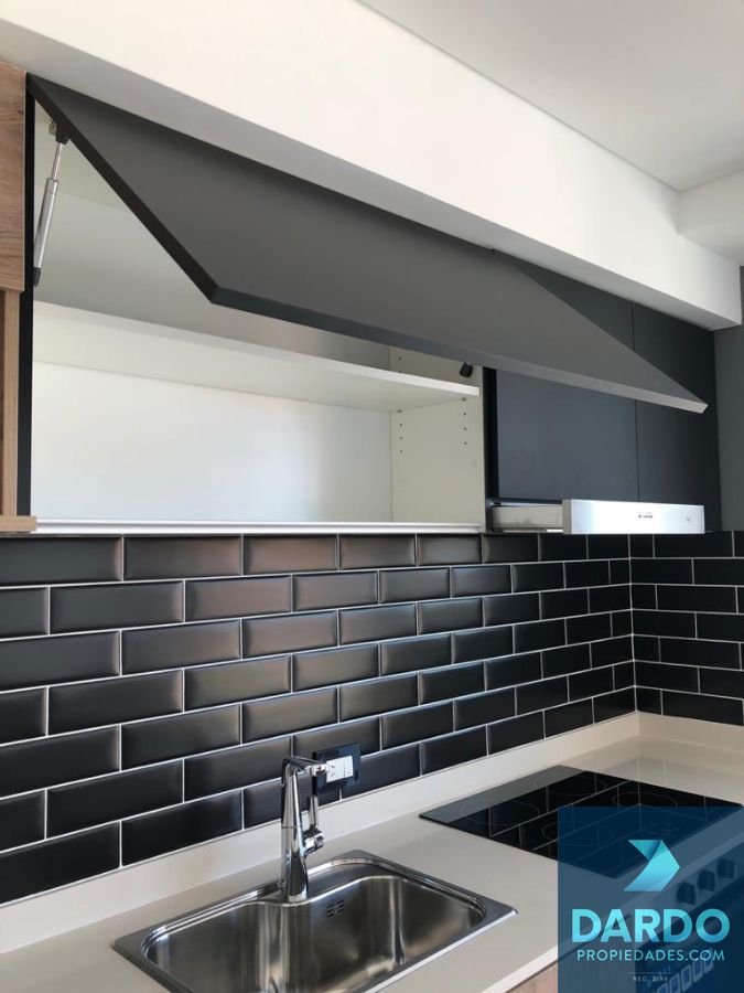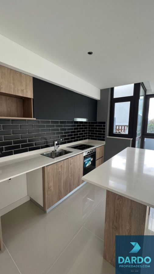 Cocina integrada con barra desayunadora, totalmente equipada con amoblamientos, anafe y horno empotrado.